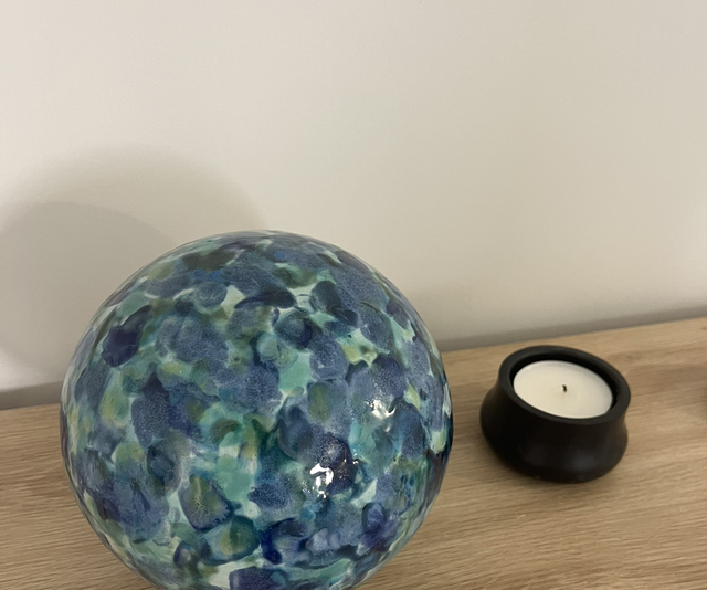 Sphère de 20cm de diamètre dans les tons de bleu et vert pour un effet fond marin. A poser tout simplement